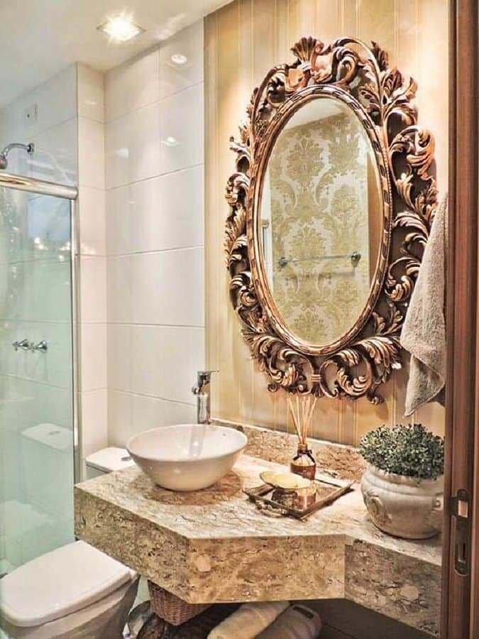 Esses espelhos não apenas refletem sua imagem, mas também contam uma história de beleza e cultura em cada detalhe de sua moldura, tornando o banheiro um ambiente verdadeiramente distinto e encantador.