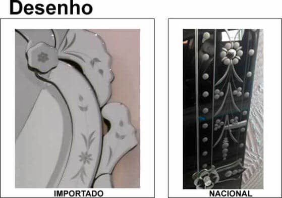 O Espelho Veneziano Nacional usa acabamento em degrade e prata, o que realça muito os desenhos contido no mesmo, se usa também o famoso Botão Pitanga, que é feito de vidro e prende as peças sem colagem, o que facilita muito na manutenção do espelho caso quebre alguma peça. Já o Espelho Importado não tem degrade, não se usa prata, não se usa botão pitanga, ele é colado, e quando quebra alguma peça fica extremamente difícil dar manutenção e há um risco muito alto de condenar a peça inteira.