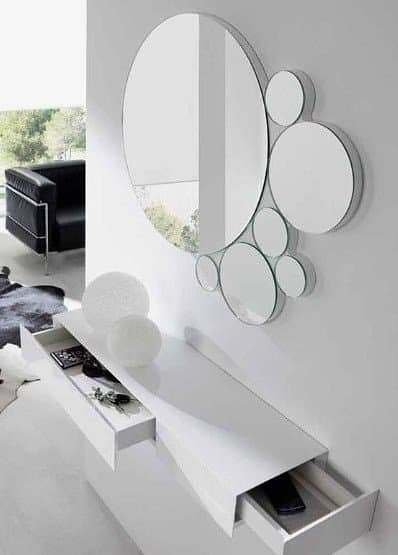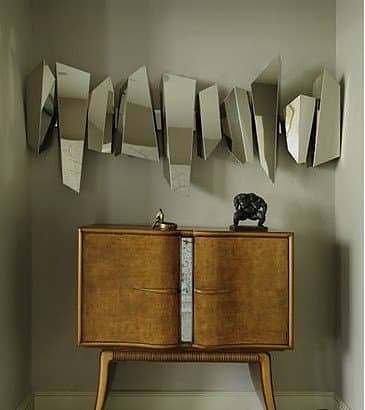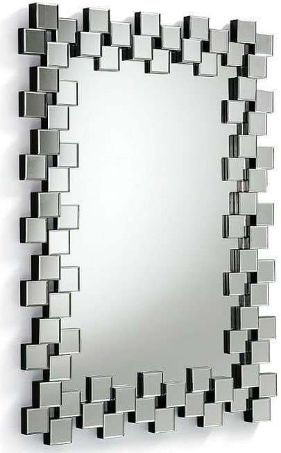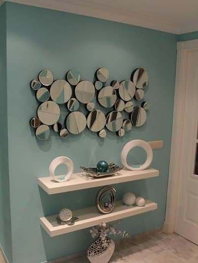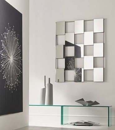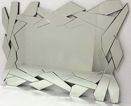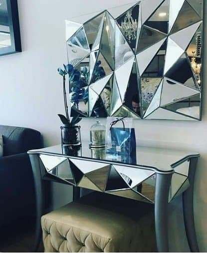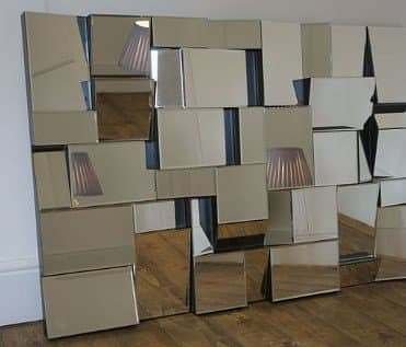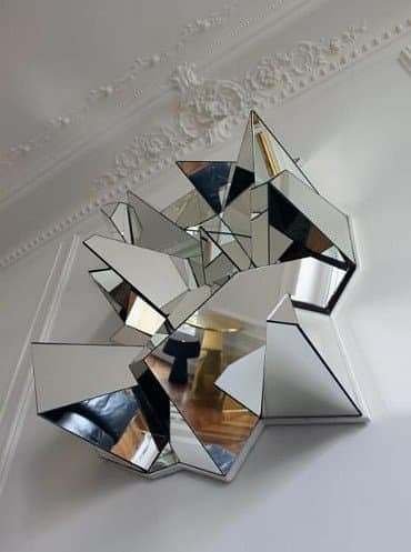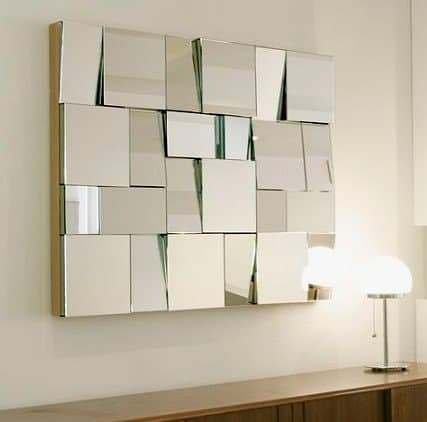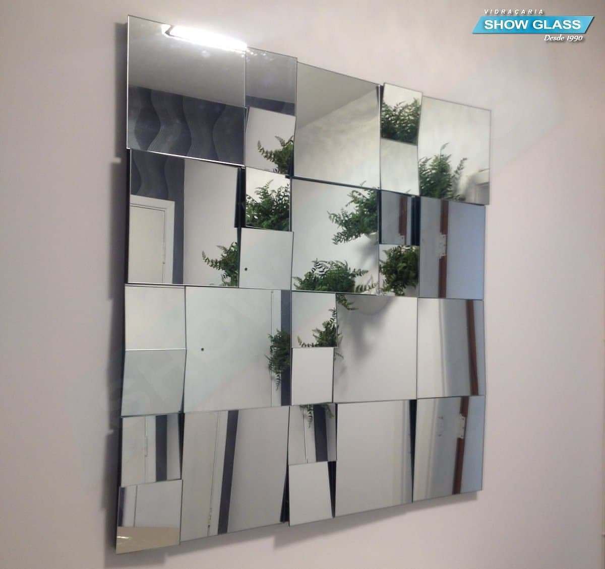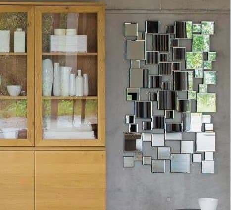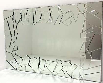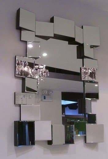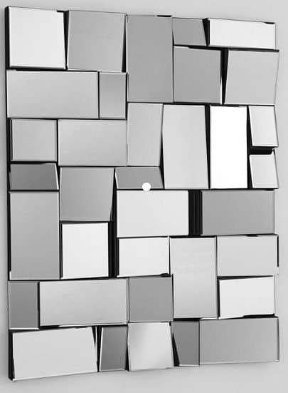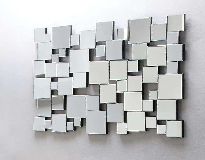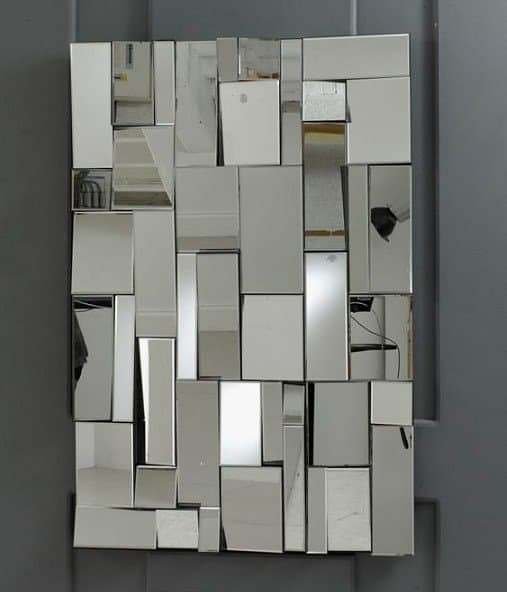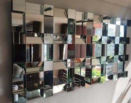Os espelhos aleatórios decorativos são pequenos pedaços de espelhos feitos em diversas formas geométricas com ou sem bisotê, distribuídos em uma placa de madeira ou alumínio de maneira aleatória. Veja abaixo alguns modelos.