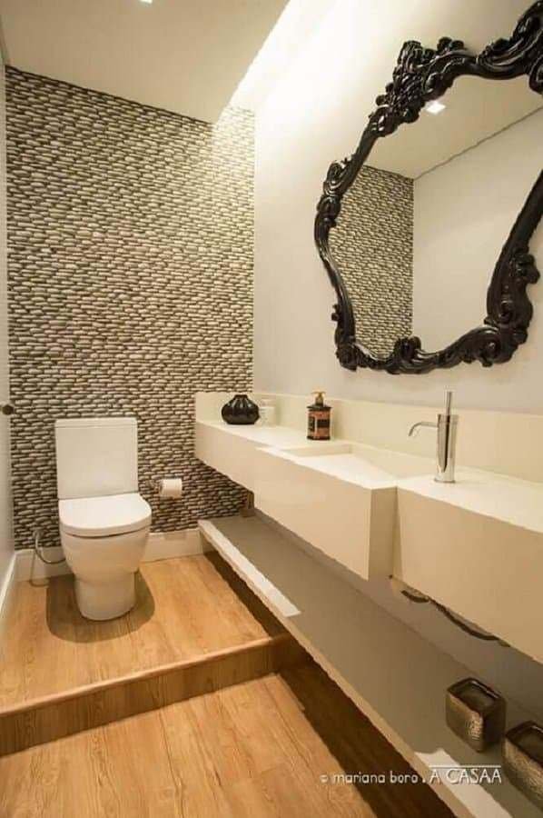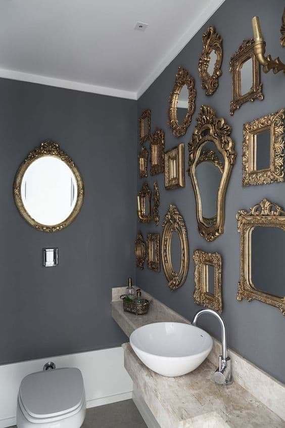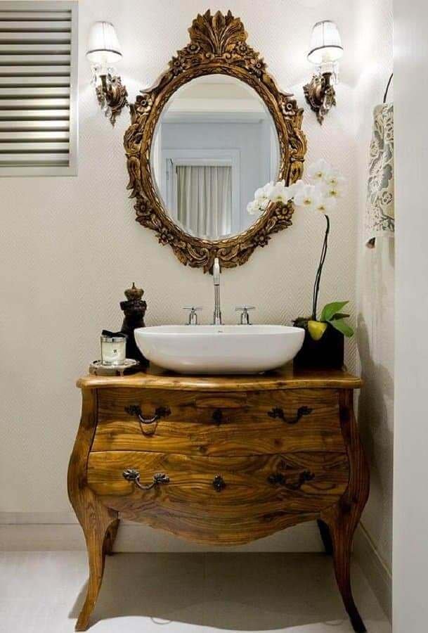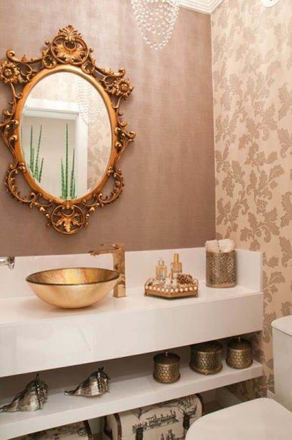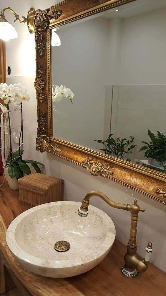 Já para um banheiro com decoração estilo clássico o espelho provençal entra como um acessório para fechar com muito requinte e sofisticação esse ambiente, principalmente quando a escolha é uma opção dourada de espelho com moldura provençal.