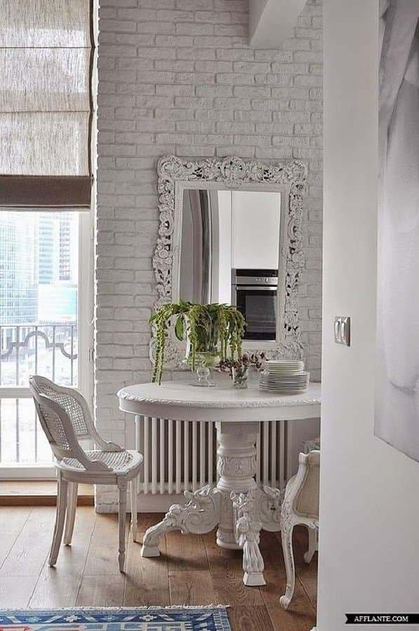 Para usar o espelho provençal grande é mais interessante quando o ambiente é amplo, pois assim com certeza ele não vai sobrecarregar o espaço e é até possível usá-lo daquele maneira mais moderna apenas apoiado na parede, já em ambientes menores é interessante investir em um espelho provençal branco ajudando na amplitude do espaço.