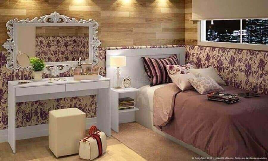 Na foto abaixo a decoração do quarto de casal ficou ainda mais sofisticada graças ao espelho com moldura provençal dourada utilizado na cabeceira da cama.