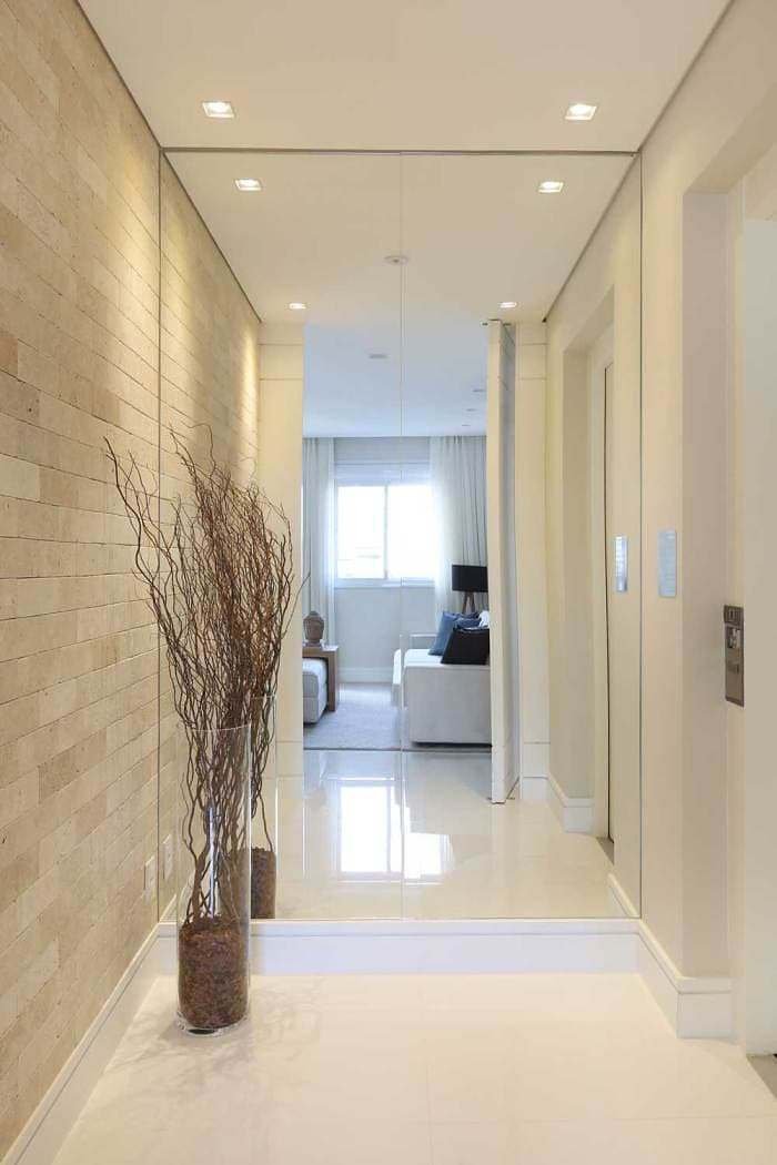 - Espelho grande: se você quer causar uma boa impressão logo na entrada da sua casa, pode apostar em um hall de entrada com espelho grande. O espelho grande pode ocupar toda a parede ou apenas uma parte dela, e pode ter uma moldura marcante ou discreta. O espelho grande vai trazer muita luz e amplitude para o seu hall de entrada, além de um toque de sofisticação e modernidade.