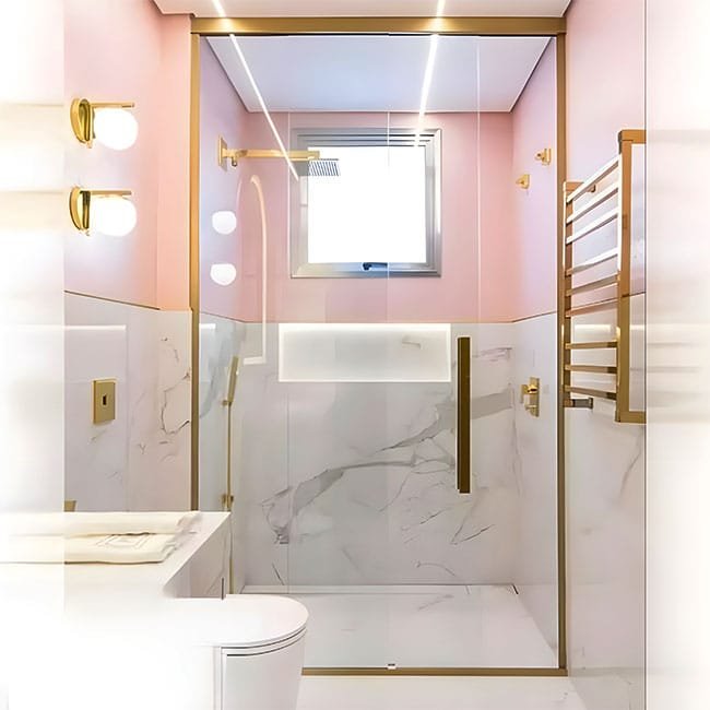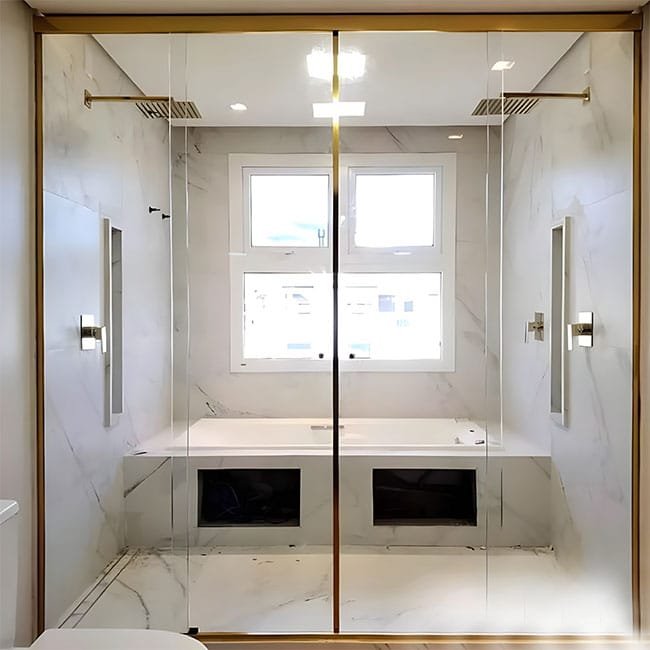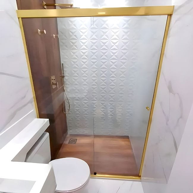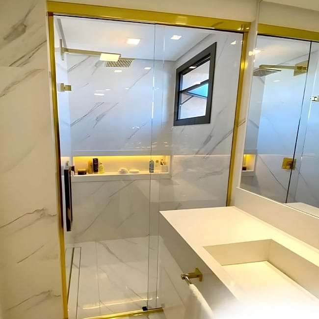 Tipos de Vidro: Uma ampla variedade de opções, incluindo Comum, Transparente, Verde, Fume, Reflecta Prata, Reflecta Bronze, Extra-Clear, Jateado, Serigrafado, Colorido, Acidato e outros, permitindo que você personalize conforme o estilo do banheiro.