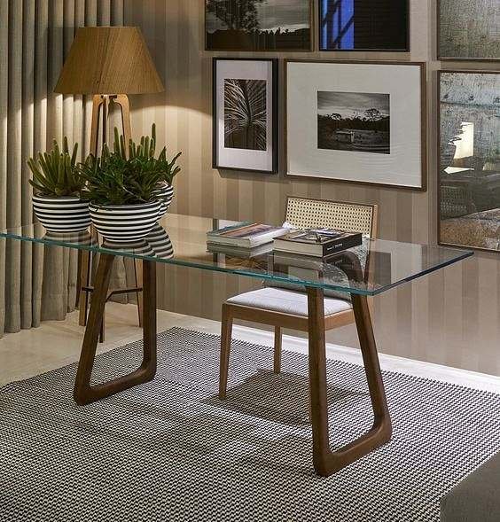 - Mesa de vidro retangular: é ideal para ambientes amplos ou alongados, pois aproveita melhor o espaço e comporta mais pessoas. A retangular também é versátil e combina com vários estilos de decoração, desde os mais clássicos até os mais contemporâneos. A base pode ser de madeira, ferro, inox, mármore ou outro material de sua preferência.